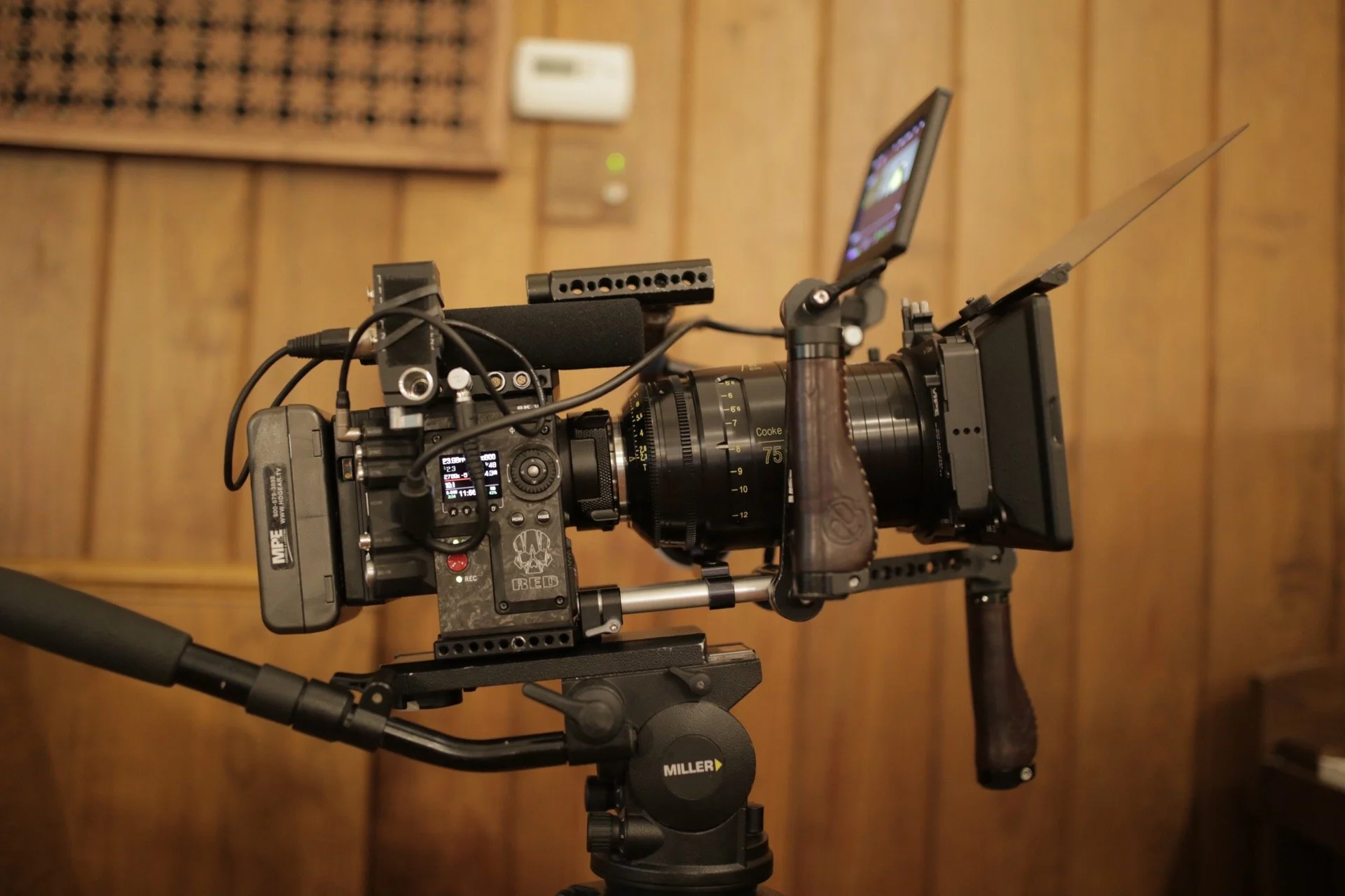 Behind-the-scenes footage of professional video camera with monitor capturing a choir in blue robes singing with a cross behind them in a church.